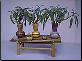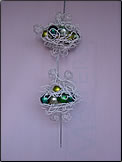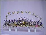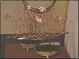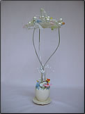 エッグ型のポットにアルミワイヤー3本で上部アシスト302をささえます。ポット部分にはアイスランドモス。ハートリーフ、アシスト304、上部302アシストの上にはパールピックの大、中、小、オーナメントリース、カピス、ビスコースをデザインします。